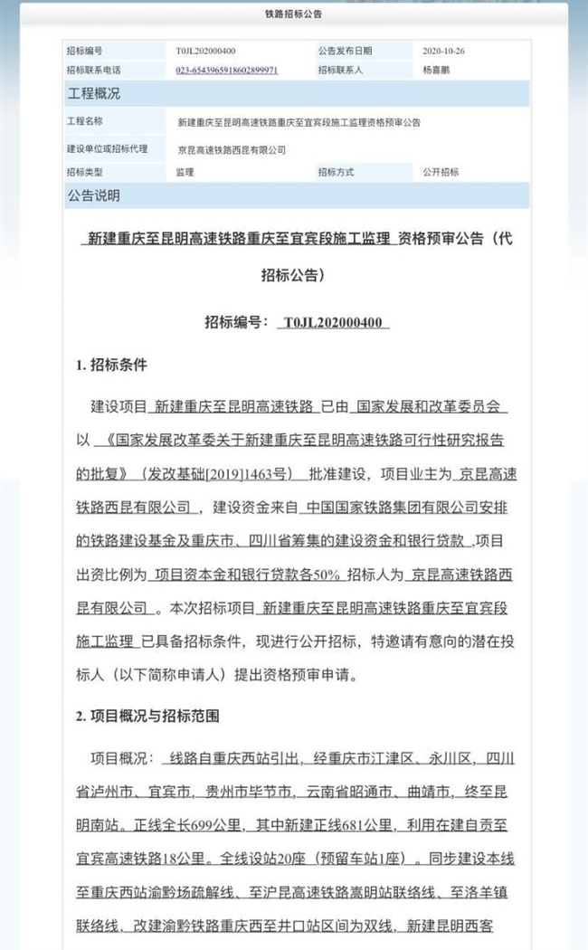 华龙网消息,近日,京昆高速铁路西昆有限公司作为项目业主,发布了《新建重庆至昆明高速铁路重庆至宜宾段站前工程施工单价承包资格预审公告》。根据招标公告内容,渝昆高铁重庆至宜宾段计划2020年12月21日开工,工期4.5年,2025年6月底竣工。