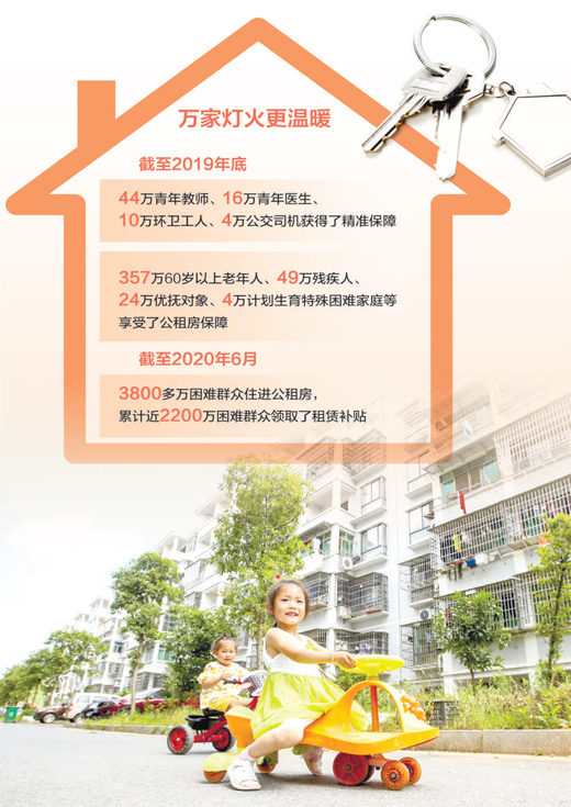 实物保障与租赁补贴并举的保障制度,有力地扩大了公租房的保障范围。不仅城镇低保、低收入住房困难家庭受益,中等偏下收入家庭住房条件也得到有效改善。截至2020年6月,3800多万困难群众住进公租房,累计近2200万困难群众领取了租赁补贴。截至2019年底,44万青年教师、16万青年医生、10万环卫工人、4万公交司机获得了精准保障;357万60岁以上老年人、49万残疾人、24万优抚对象、4万计划生育特殊困难家庭等享受了公租房保障。