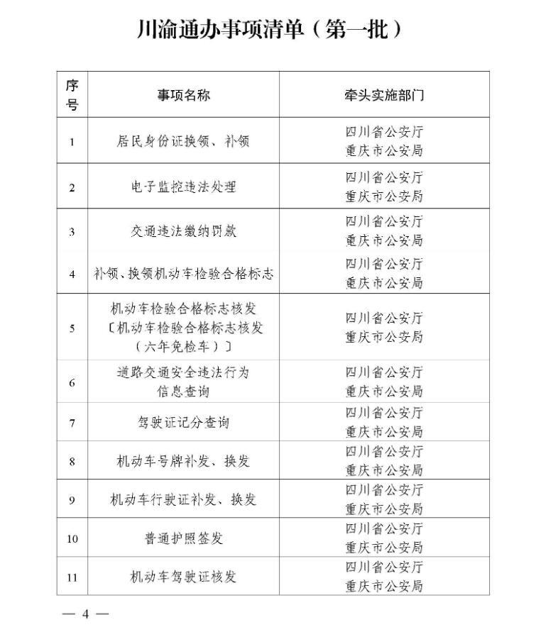 11月3日,四川在线记者从四川省政府获悉,10月30日四川省人民政府办公厅、重庆市人民政府办公厅印发川渝通办事项清单(第一批)的通知。其中,涉及身份证换证、补办;电子监控违法处理以及普通护照签发等95项通办事项。