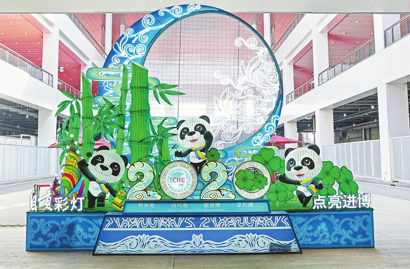 十一月三日在国家会展中心(上海)拍摄的自贡彩灯。第三届中国国际进口博览会现场的多处彩灯为展会增添了色彩与魅力。新华社记者张豪夫摄