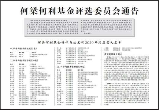 何梁何利基金是香港爱国金融实业家何善衡、梁銶琚、何添、利国伟先生于1994年3月30日捐资创立的、以奖励中华人民共和国杰出科技工作者为宗旨的科技奖励基金。依据《评选章程》规定的“公平、公正、公开”评选原则,经过提名推荐、专业评审、考察听证、终评审定的既定程序, 2020年8月28日评选委员会全体会议评选决定,2位为我国科技进步与创新作出卓越贡献的杰出科技工作者,荣获“何梁何利基金科学与技术成就奖”,授予奖牌、奖金100万港元;30位在科学技术领域作出重大发明、发现和科技成果的优秀科技工作者,荣获“何梁何利基金科学与技术进步奖”,授予奖牌、奖金各20万港元;20位具有高水平科技成就,通过技术创新和管理创新,创造重大经济效益和社会效益的优秀科技工作者,荣获“何梁何利基金科学与技术创新奖”,授予奖牌、奖金各20万港元。