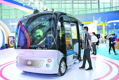 “十三五”时期,我国科技实力跃上新的大台阶。图为第28届广州博览会上展出的无人驾驶巴士。新华社发