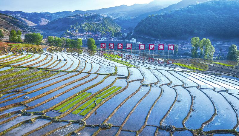 2020年4月28日,普格县螺髻山镇黄草坪村的村民在梯田中育秧。帮扶该村的泸州市龙马潭区工作人员为他们引进良种,促其增产增收。