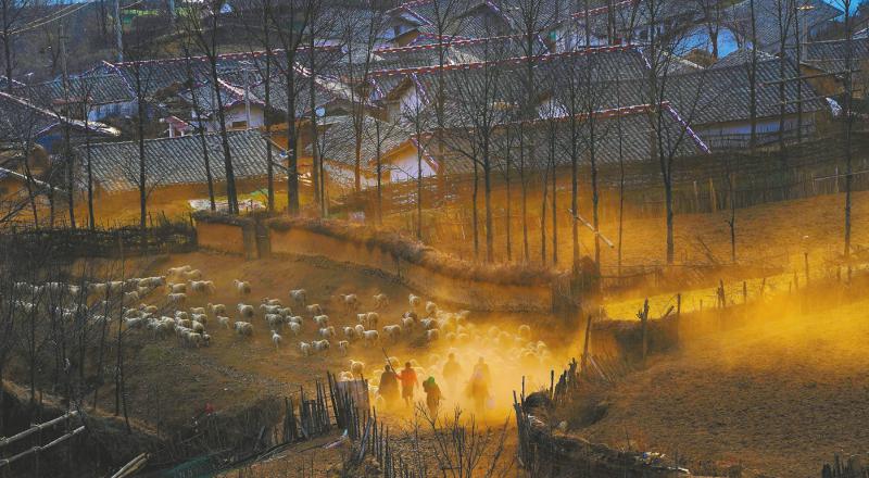 2020年3月21日,金阳县的村民放牧归家。金阳县在乡村大力发展畜牧业基地,引导村民通过发展畜牧养殖业脱贫致富。