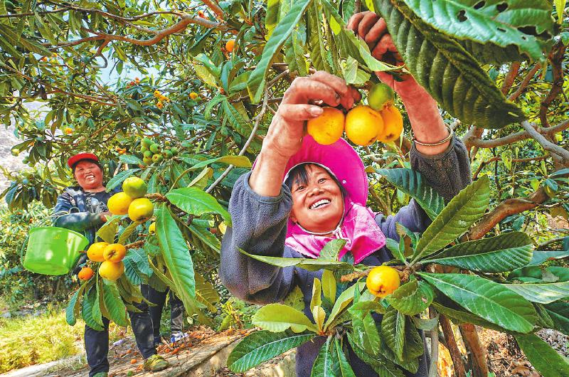 2020年3月22日,金阳县热水河村西衙门组的早春枇杷成熟了。种植枇杷,让村民王成青(右)和姐妹们过上了好日子。