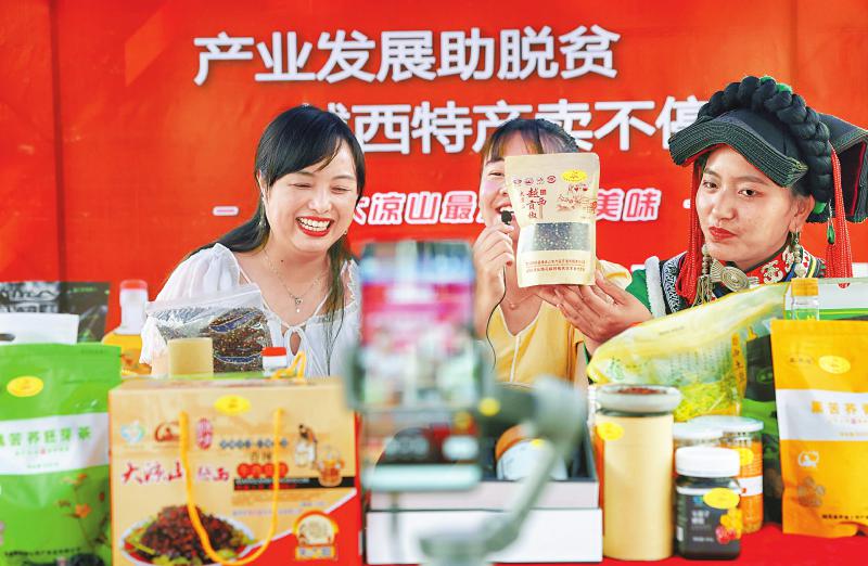 2020年8月28日,在越西县城北感恩社区组织的扶贫产品展销会上,种养大户正通过直播带货方式推广农特产品。