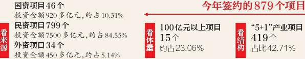 时隔1年,签约金额接近翻倍。再看资金来源,今年签约项目中,国资项目46个,投资金额920亿元,约占10.31%;民资项目799个,投资金额7500多亿元,约占84.55%;外资项目34个,投资金额450多亿元,约占5.14%。而去年的签约投资金额,民资项目约占78.51%,外资占4.89%。