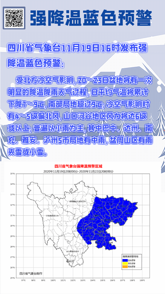 11月19日下午,四川省气象台发布强降温蓝色预警