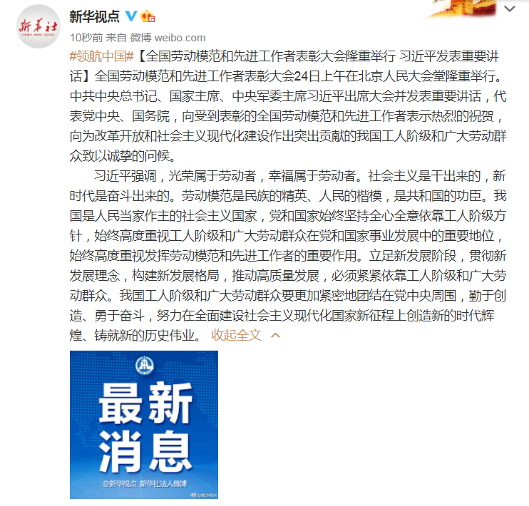 全国劳动模范和先进工作者表彰大会在北京举行,习近平发表重要讲话