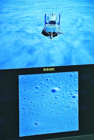 不久,探测器进行障碍自动检测,选定着陆点后,开始避障下降和缓速垂直下降,平稳着陆于月球正面风暴洋的吕姆克山脉以北地区。