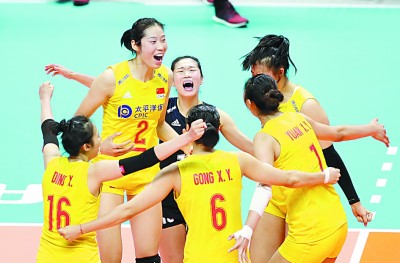 中国女排队员在2019年女排世界杯比赛中庆祝得分。新华社发