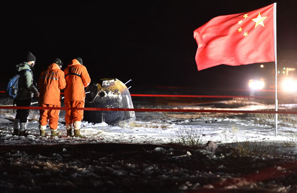 23天后的12月17日凌晨,内蒙古四子王旗。在闯过月面着陆、自动采样、月面起飞、月轨交会对接、再入返回等多个难关后,历经重重考验的嫦娥五号返回器携带月球样品,成功返回地面。