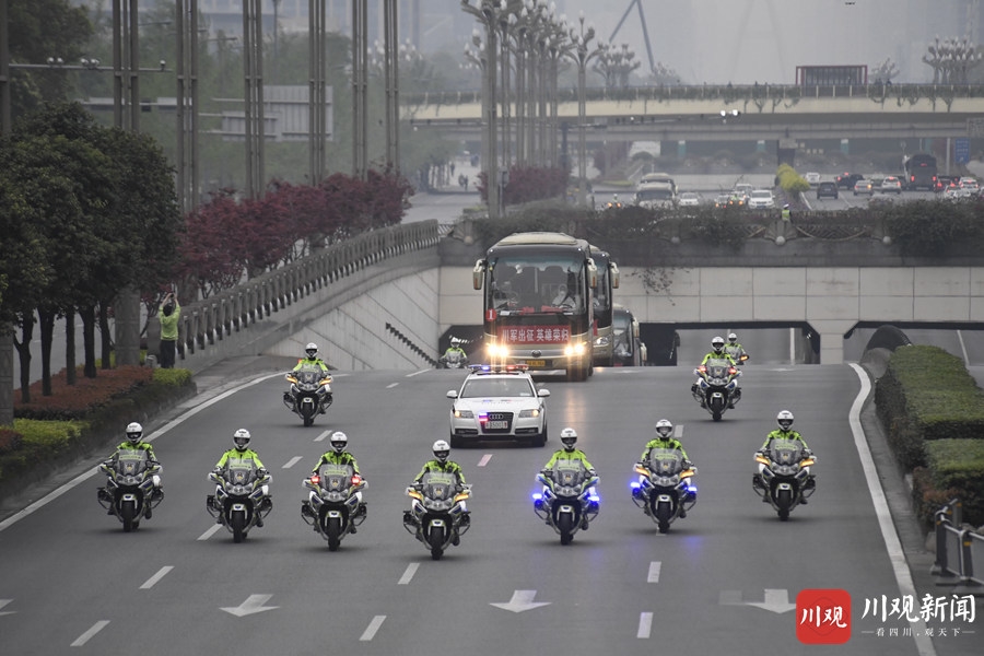 4月7日,下午4点20分,伴随着歌曲《我爱你中国》的旋律,12辆大巴车载着医疗队员们从双流机场出发,前往黑龙滩。途中,6辆警用摩托车、2辆警车灯光闪烁,在前方护送车队缓缓驶离。图为车队经过天府大道。四川在线记者 李向雨 摄