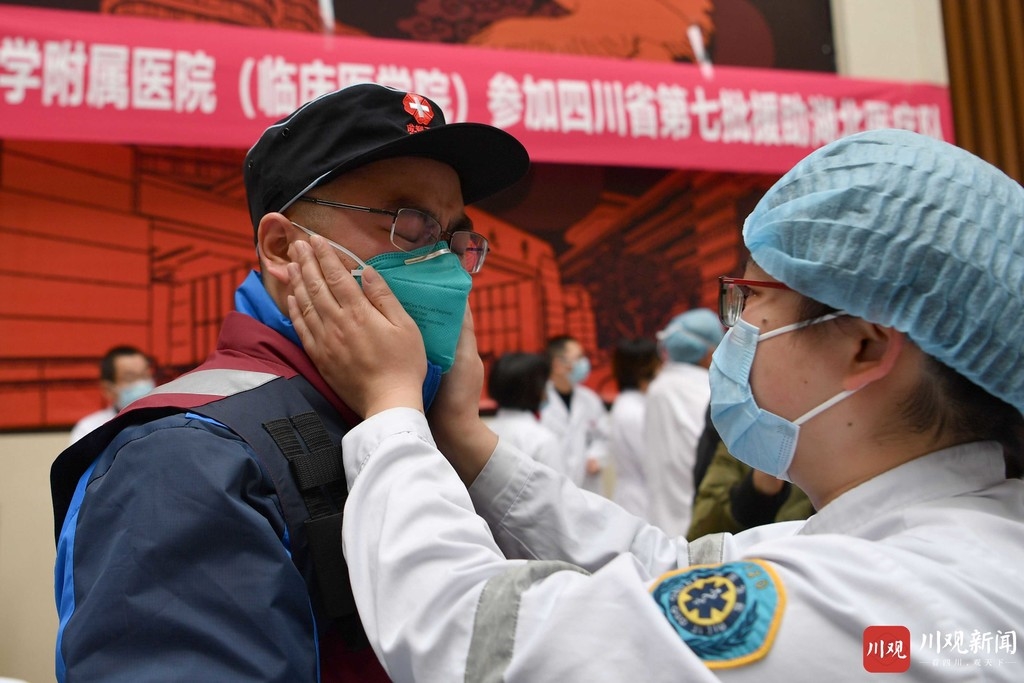 2月13日,成都大学附属医院的医务人员为援助湖北医疗队启程出征送行。四川在线记者 何海洋 摄