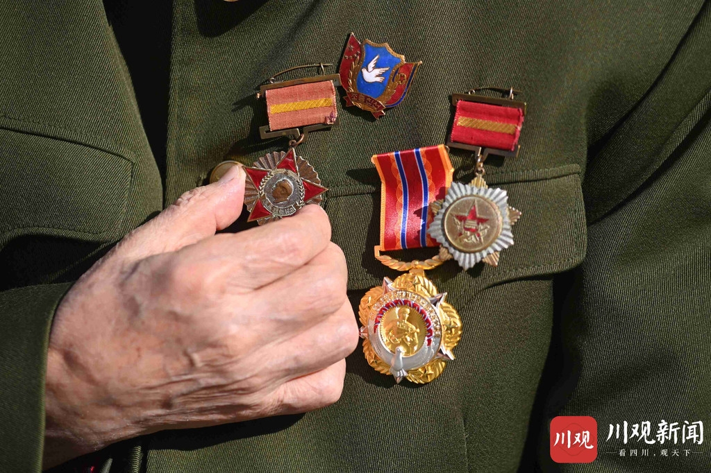 10月21日,在四川省革命伤残军人休养院,中国人民志愿军老战士易如元(左)轻抚胸前的“中国人民志愿军抗美援朝出国作战70周年”纪念章。四川在线记者 华小峰 摄