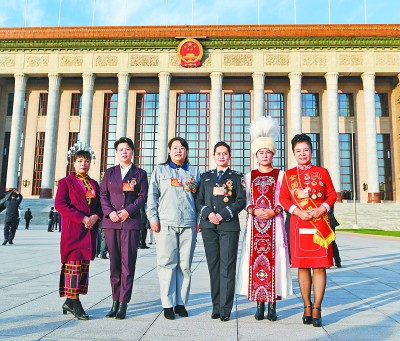 2020年11月24日,出席全国劳动模范和先进工作者表彰大会的代表在北京人民大会堂外合影留念。新华社发