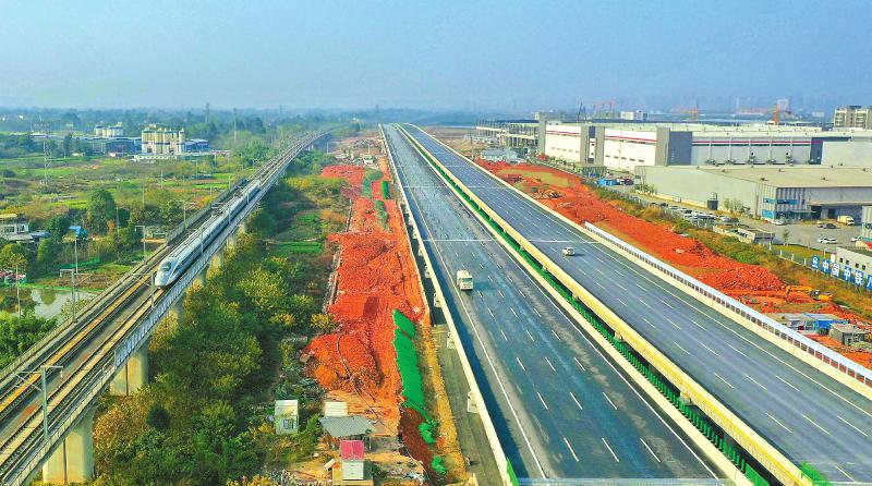 是与成渝高铁并行的成都天府国际机场高速公路。 四川日报全媒体记者何海洋摄