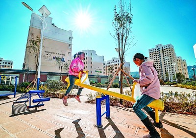 在云南省会泽县新城易地扶贫搬迁安置小区里,8岁的张玉(左)与朋友一起玩跷跷板。新华社发