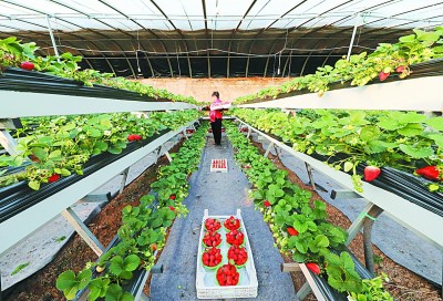 农民在河北省顺平县易地扶贫搬迁安置小区附近的岩田现代农业园区大棚内采摘草莓。新华社发