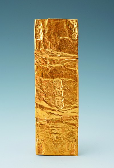 广东南海一号南宋沉船出土的“韩四郎”金叶子。本报记者李韵摄