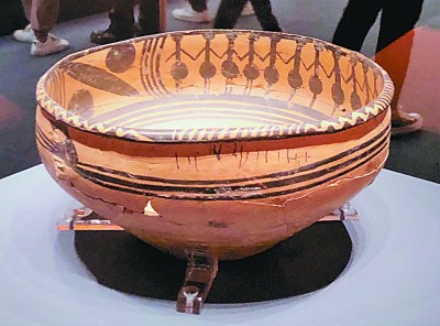 甘肃出土的跳舞纹彩陶盆。本报记者李韵摄