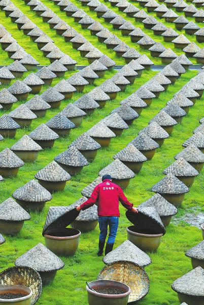 9月 9月22日,泸州市合江县佛荫镇酱油酿造坊晒露场,5万口晒露缸依次排列,工作人员在晾晒“五比一”酱油。