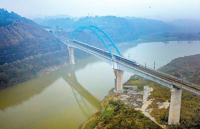 12月 12月24日,连接成都和重庆的成渝高铁首开复兴号动车组,列车最高运行时速也提高到350公里,实现成渝间高铁公交化运营1小时通达。图为G8607复兴号高铁驶过资阳市沱江特大桥。
