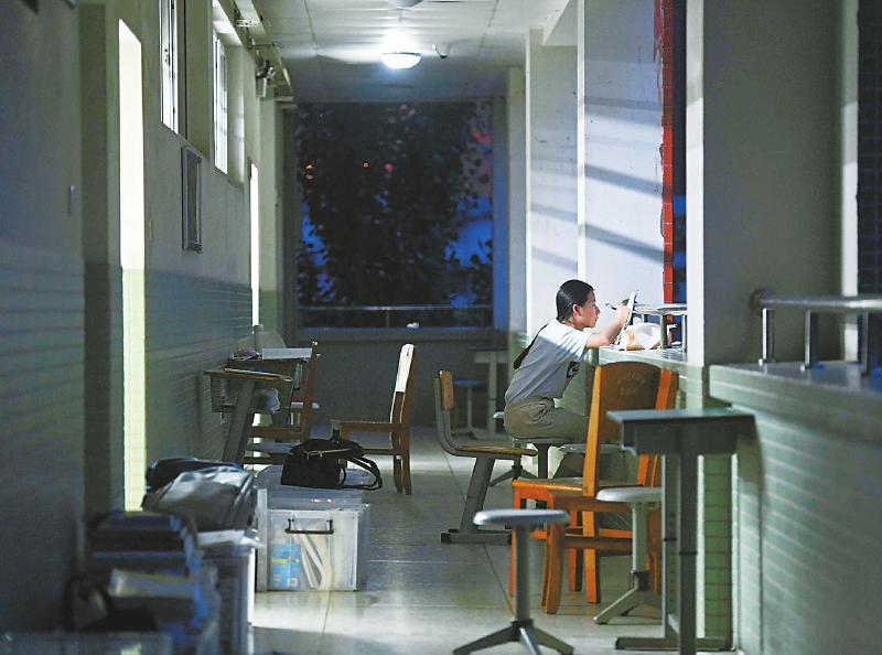 7月 一位四川师大附中的高三学生在走廊里上考前最后一个晚自习。2020年高考延期一个月举行,考试时间为7月7日至8日。