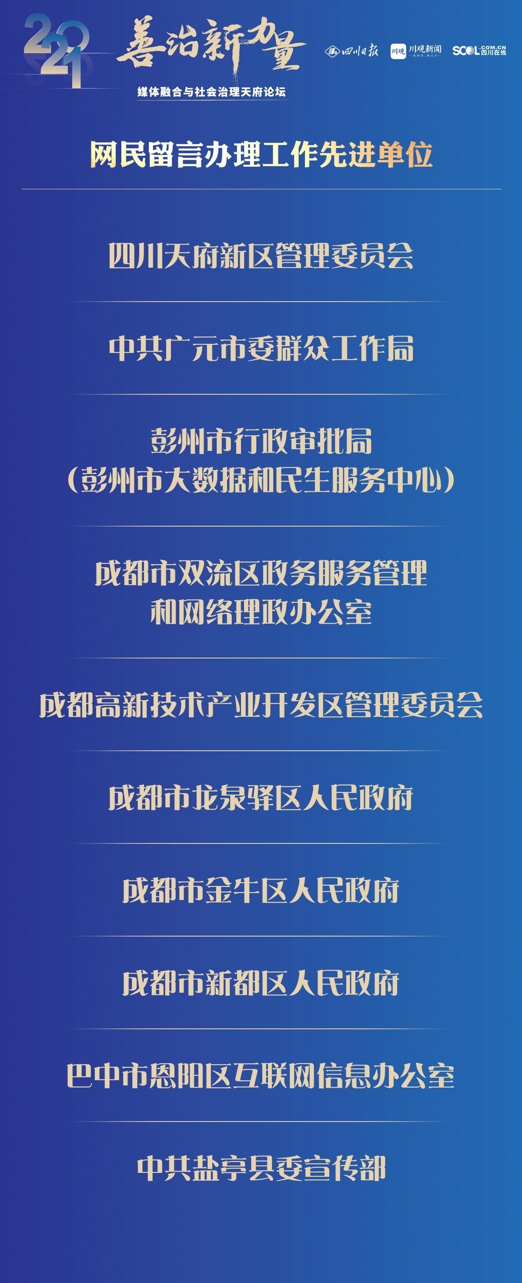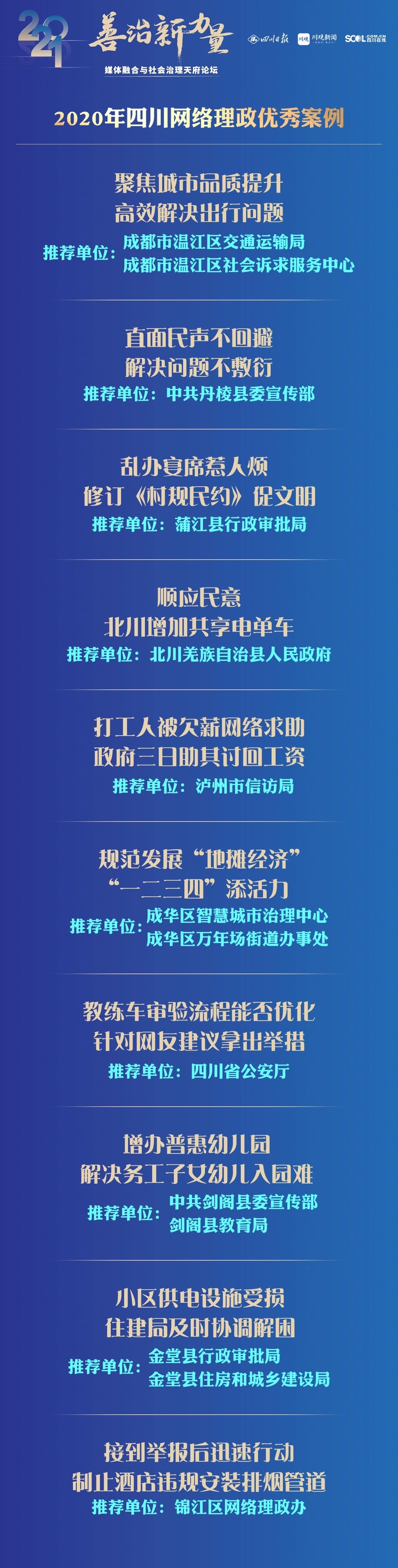 论坛公布了“2020四川网络理政十大优秀案例”“问政四川网民留言办理工作先进单位”“问政四川网民留言办理工作奋进单位”。
