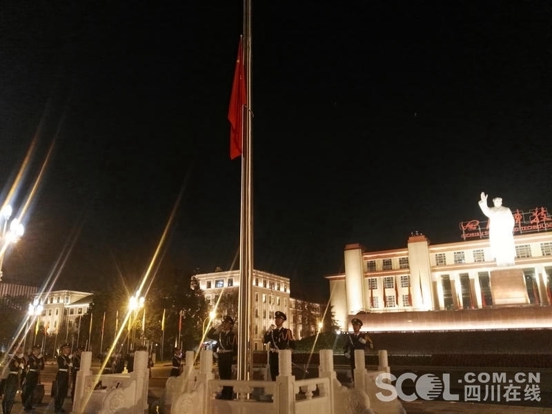 伴随着雄壮的国歌奏响和一声铿锵豪迈的“敬礼”,“蓉城国旗护卫队”升旗手将手中的五星红旗向空中一扬,鲜艳的五星红旗迎着天空,在天府广场上缓缓升起,武警战士行军礼,人们立正行注目礼,少先队员行队礼。