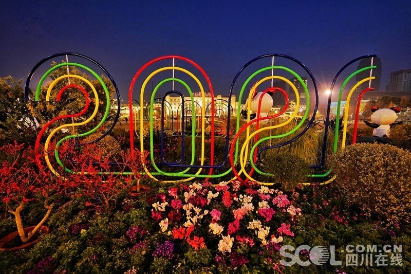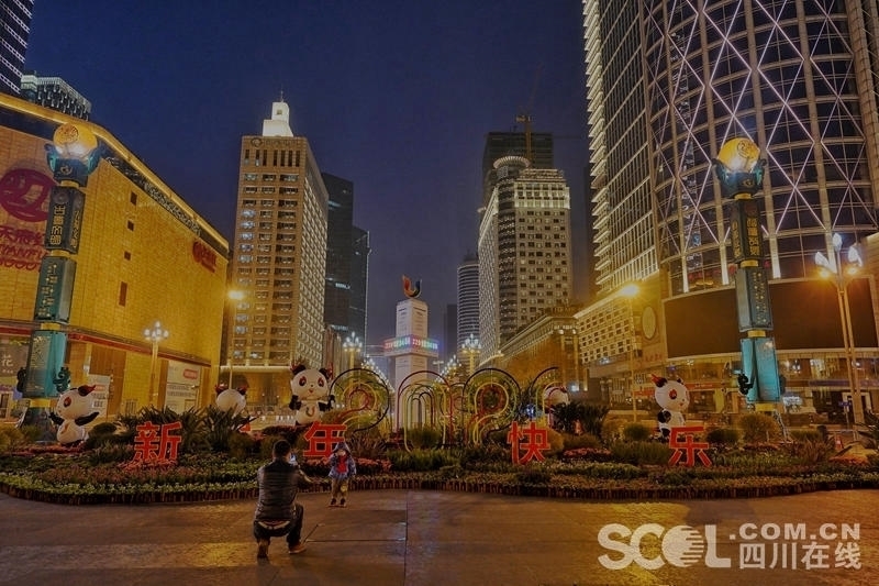清晨的天府广场,鲜花簇拥,彩旗飘扬,呈现出一派喜庆热烈的节日景象。