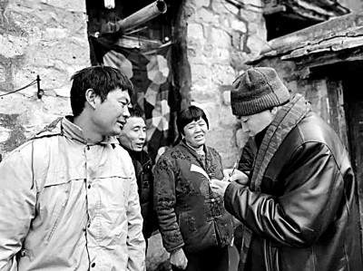 作家关仁山(右一)在脱贫一线采访。资料图片