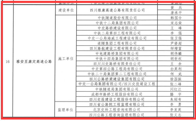 其中雅康高速公路(雅叶高速雅安至康定段)获优质工程奖,黄兵等22人获优秀项目建设者称号。