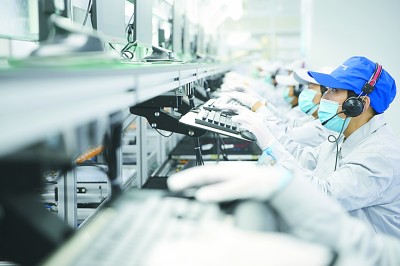 在中国(黑龙江)自由贸易试验区哈尔滨片区内的网信事业配套保障体系项目生产线上,工人在进行产品检测。新华社发