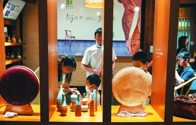 二〇二〇年六月十三日,在成都宽窄巷子“非遗宽窄院”,道明竹编的传承人肖瑶(左一)向游客介绍竹编工艺。新华社发