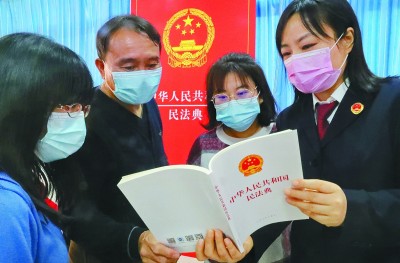 图为河北省秦皇岛市海港区人民检察院检察干警为社区居民普及民法典相关法律知识。曹建雄摄/光明图片