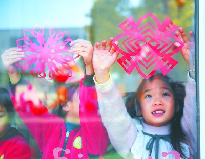 浙江省长兴县幼儿园的孩子们在贴迎春窗花。新华社发