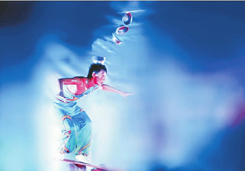 四川杂技,有个常见的动作“顶”。顶竿、顶碗还有转碟,都与顶有关。“南宋周密《武林旧事·诸色伎艺人》中有‘顶橦踏索’的记载,说明那时就已有顶竿表演了。”黄红军比画道,顶杆以头作为支撑点,根据竿上演员人数分为单人、双人、三人表演等。单人表演多以顶功为主,底座在完成支撑的同时,往往进行一些增大其技术难度的表演。双人、三人竿由于承重量较大,底座除支撑外一般不进行其他技术表演。顶碗,演员头部顶一摞瓷碗,表演劈叉、金鸡独立、别元宝、倒立等技巧动作。黄红军很自豪,“四川顶碗技巧全国领先,遂宁杂技团的青花瓷顶碗节目还上过央视春晚呢!”