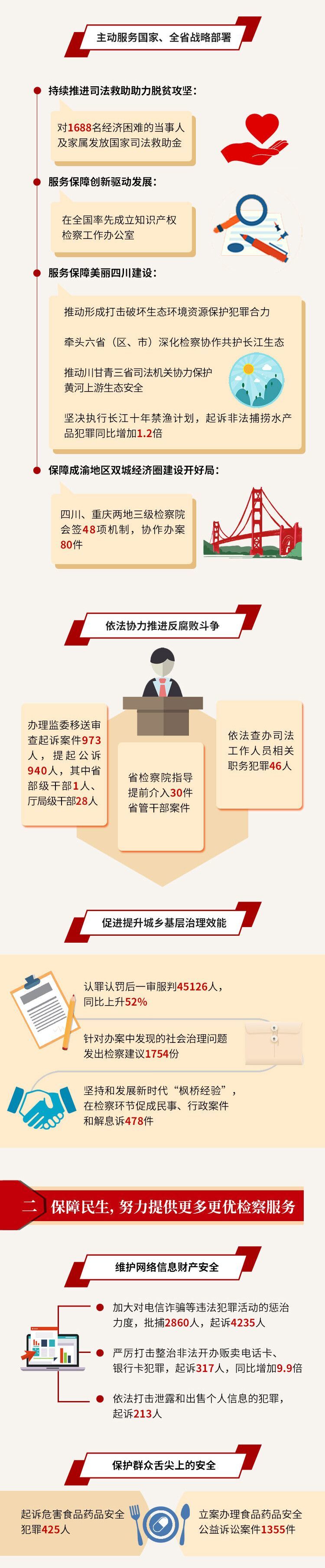服务大局,护航疫情防控和经济社会发展;保障民生,努力提供更多更优检察服务;守护正义,监督法律统一正确实施;提升能力,着力打造过硬检察队伍……报告从多个方面梳理了去年四川检察工作的重点和亮点。这些检察工作给四川经济社会发展提供了怎样的法治保障?给四川百姓带来了哪些法治福利?