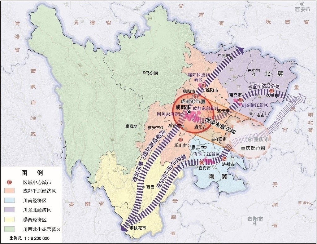 《纲要草案》提出,未来五年,四川经济总增速计划保持在6%,稳中求进。如果把四川经济比作一只腾飞的大雁,那么“一轴两翼三带”就像是它的起飞姿势。