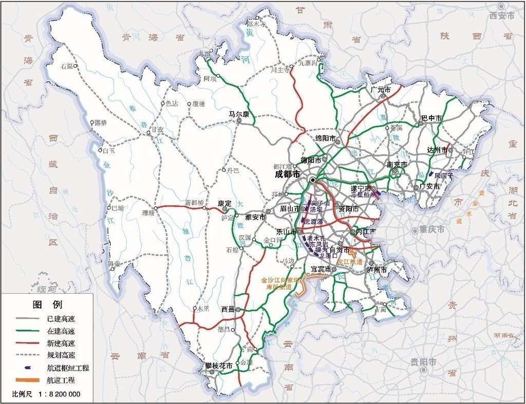 水运方面,建设岷江犍为、龙溪口、老木孔、虎渡溪、汤坝、尖子山等航电枢纽。开工建设岷江东风岩及渠江风洞子航电枢纽,加快推进金沙江向家坝库区航道、沱江航道等提升工程及涪江三星船闸工程建设。建成乐山港重点作业区。