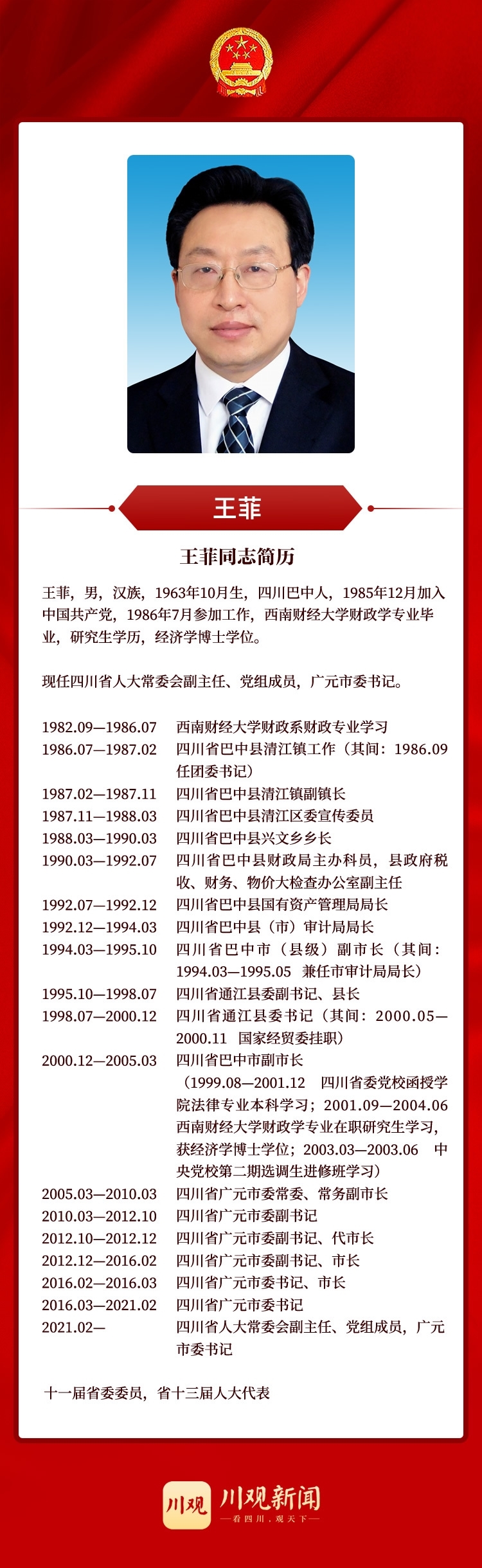 王菲,男,汉族,1963年10月生,四川巴中人,1985年12月加入中国共产党,1986年7月参加工作,西南财经大学财政学专业毕业,研究生学历,经济学博士学位。