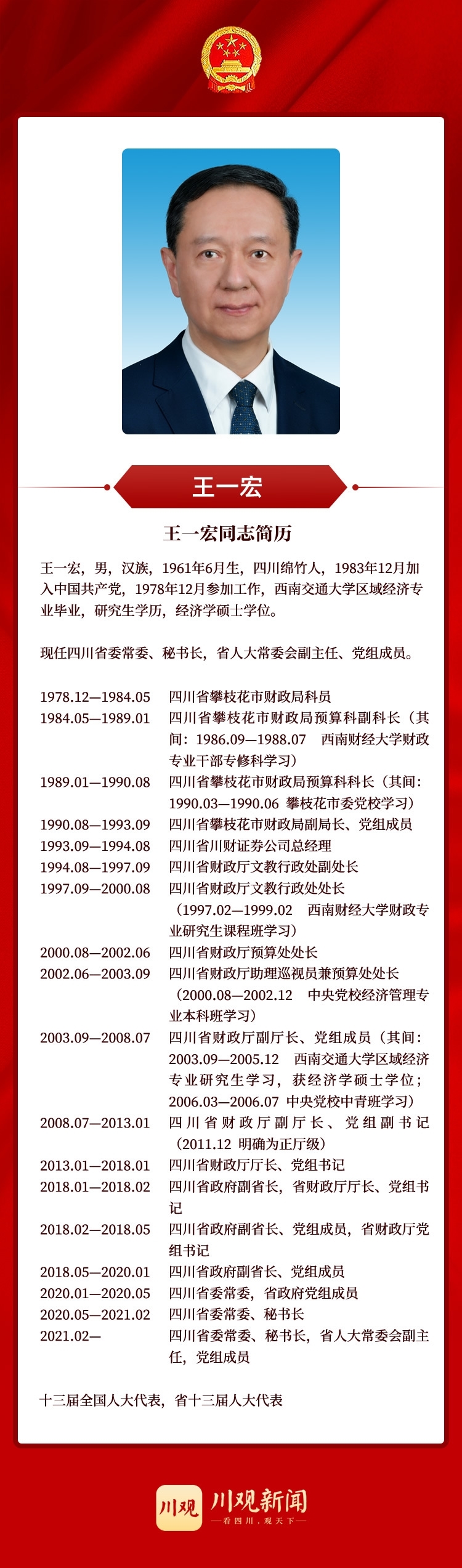 王一宏,男,汉族,1961年6月生,四川绵竹人,1983年12月加入中国共产党,1978年12月参加工作,西南交通大学区域经济专业毕业,研究生学历,经济学硕士学位。