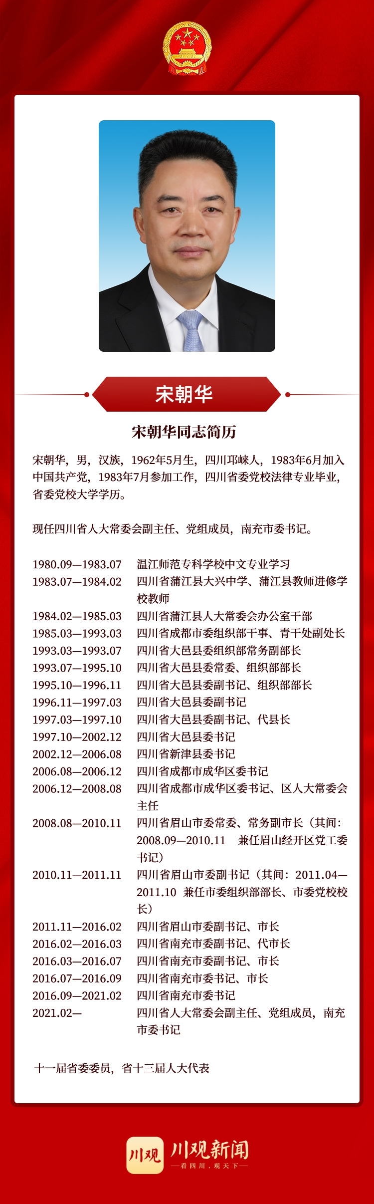 宋朝华,男,汉族,1962年5月生,四川邛崃人,1983年6月加入中国共产党,1983年7月参加工作,四川省委党校法律专业毕业,省委党校大学学历。