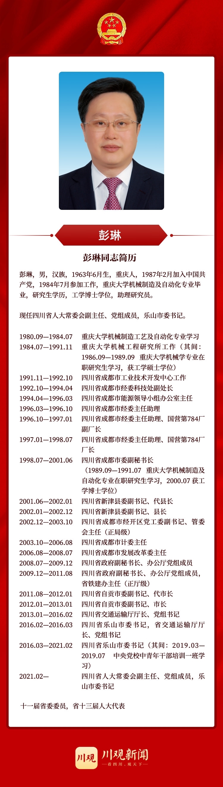 2021.02-- 四川省人大常委会副主任、党组成员,乐山市委书记