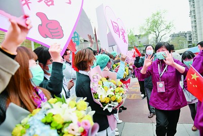 2020年4月3日,西安交通大学第二附属医院的援鄂医疗队队员返回医院时受到热烈欢迎。新华社发