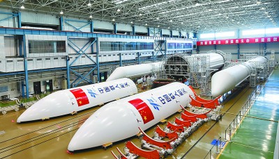 中国航天科技的发展进步离不开数十年如一日追求着职业技能极致化的大国工匠。图为主要承担火箭总装、质量特性测量、总装后的检查试验和水平测试工作的天津航天长征火箭制造有限公司总装测试车间。新华社发