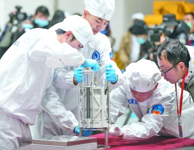 科研人员打开嫦娥五号返回器舱门,取出装有月球样品的容器并进行称重。新华社发