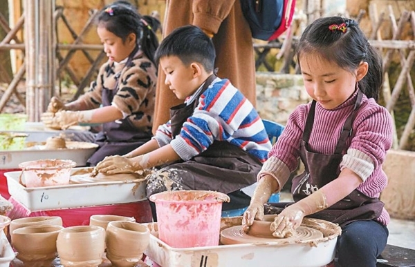 2月16日正月初五,蒲江县甘溪镇明月村,小朋友在体验非遗技艺制陶中度过春节。