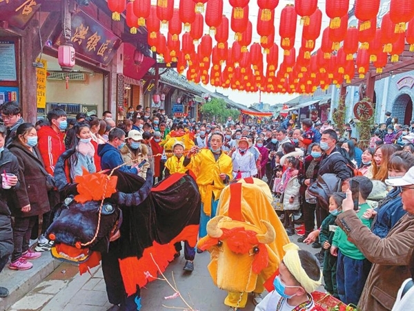 2月15日正月初四,成都市龙泉驿区洛带古镇上举行的牛儿灯传统文化展示,生动的表演给牛年新春增添了不少喜庆。